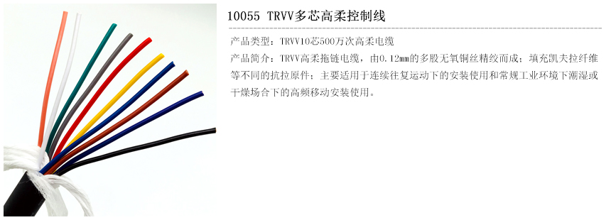 柔性TRVV拖链电缆主要适用于连续往复运动下的安装使用,特别是常规工业环境下潮湿或干燥场合下的高频移动安装使用;如:数控机场设备、自动化设备、现代化标准部件的拖链中及物流系统、操控系统、机械自动化系统等需要高频移动弯曲的机械设备与场合下使用。